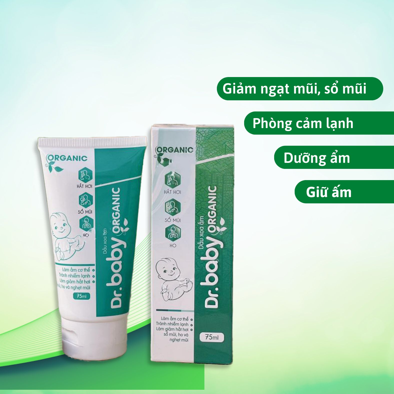 Tác Dụng Đa Năng: Dr.Baby Organic không chỉ giúp làm ấm cơ thể bé, mà còn hỗ trợ giảm các triệu chứng cảm lạnh, nghẹt mũi, ho, và đau bụng.