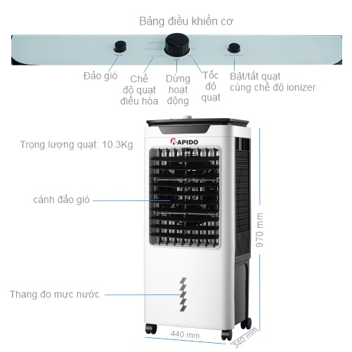 Quạt điều hòa Rapido TURBO 6000-M là sự kết hợp hoàn hảo giữa 3 thiết bị: điều hòa, máy lọc không khí và quạt thông thường. Sản phẩm mạnh mẽ, tiết kiệm, siêu êm thích hợp dùng trong phòng ngủ, phòng khách, phòng bếp.