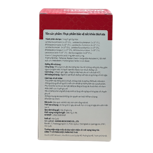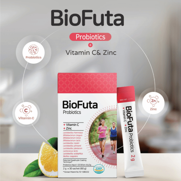 BioFuta là men vi sinh cao cấp đến từ Hàn Quốc với công thức 10 chủng lợi khuẩn đa dạng kết hợp cùng Vitamin C và Kẽm giúp hỗ trợ toàn diện cho hệ tiêu hóa và miễn dịch Sản phẩm được ứng dụng công nghệ bao bọc lợi khuẩn tiên tiến giúp tăng khả năng sống sót và phát huy hiệu quả trong đường ruột Nhờ có bổ sung prebiotic BioFuta không chỉ bổ sung lợi khuẩn tức thời mà còn giúp duy trì hệ vi sinh ổn định lâu dài phù hợp cho người gặp vấn đề tiêu hóa mạn tính và người cần chăm sóc đường ruột hằng ngày.
